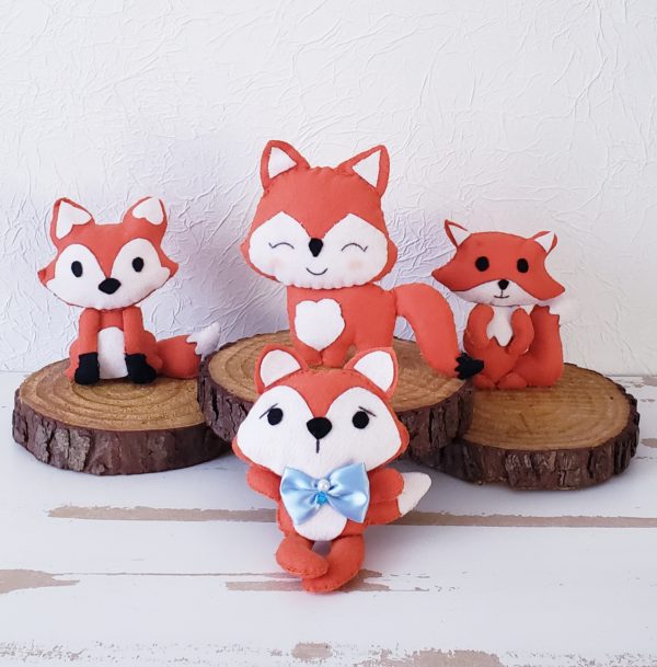 Kit 4 raposinhas feltro + 3 bolachas de madeira (locação)